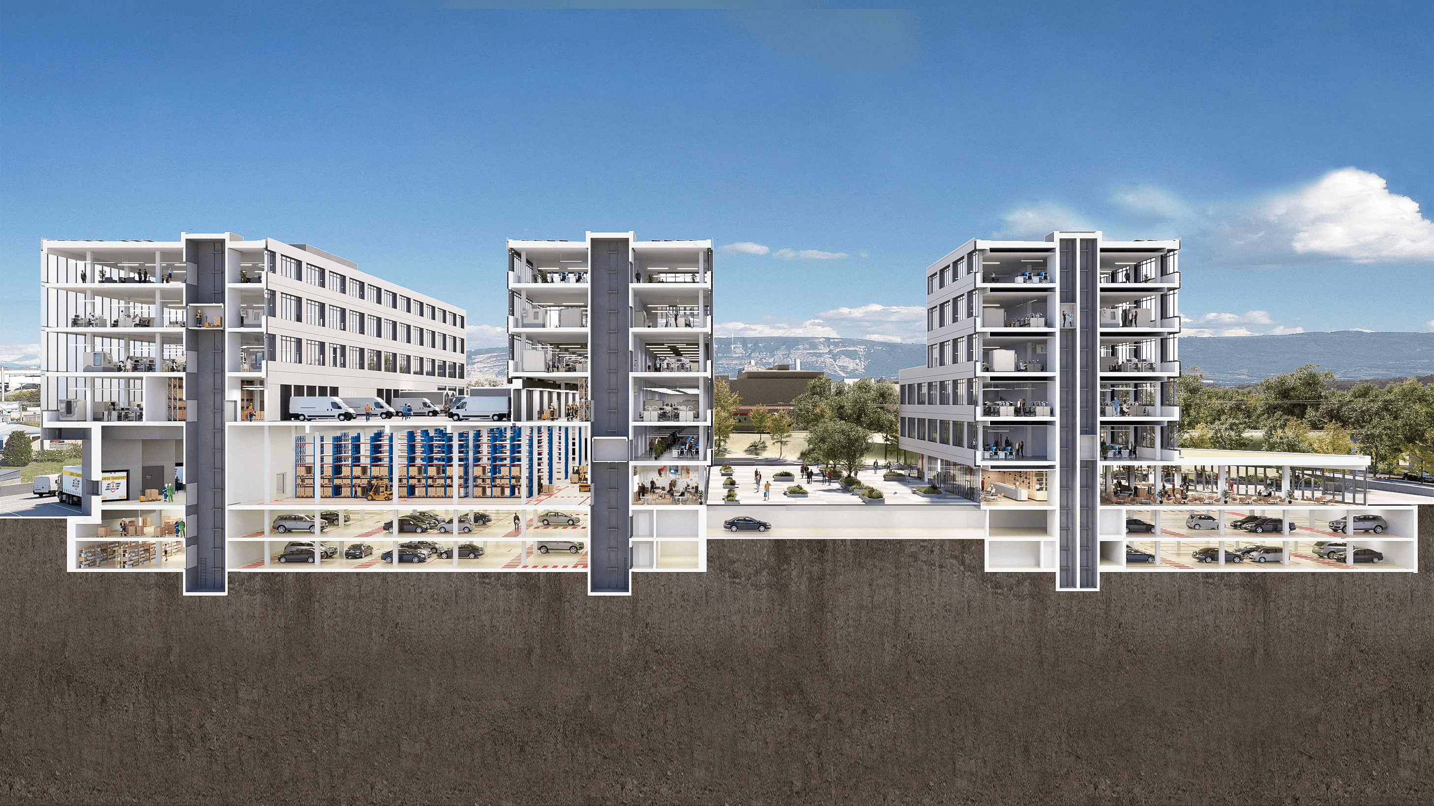 Built on the site of a former factory, RUBIX will consist of two multi-modular, high-tech, eco-efficient buildings offering 47’000 sqm of space. The interiors of the building will be designed in a free plan system, and floor load capacity and ceiling height will allow for unlimited re-configuration of the spaces without resorting to large structural modifications. Tenants can personalise their premises according to their needs and transform them as their activities evolve. This allows tenants to maintain their logistics activities, workshops, laboratories, and offices under one roof.