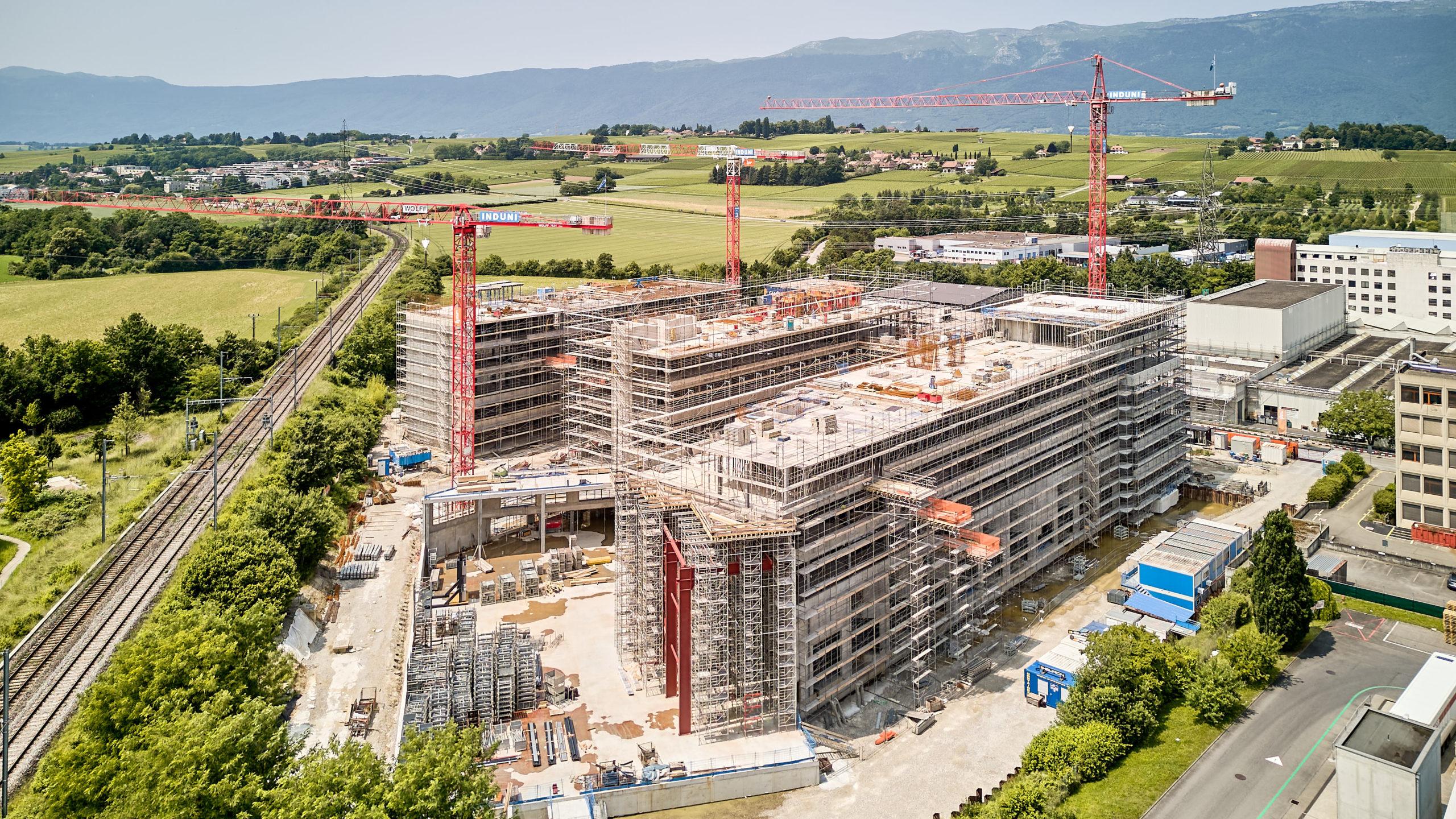 Depuis la pose de la première pierre en septembre 2024, il n’aura fallu que neuf mois pour achever, dans les délais, le gros œuvre de ce projet pionnier qui redéfinit les espaces industriels. Lors de cette phase, près de 29’000 m3 de béton et 3’860 tonnes d’armatures ont été employés. 18’300 m2 d’échafaudages ont par ailleurs été posés pour permettre à plus de 120 ouvriers de travailler en parallèle sur ce chantier d’envergure.